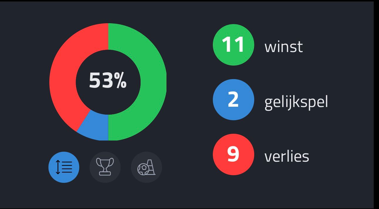 11 overwinningen, 2 gelijke spelen en 9 nederlagen. Doelsaldo van 67- 53.